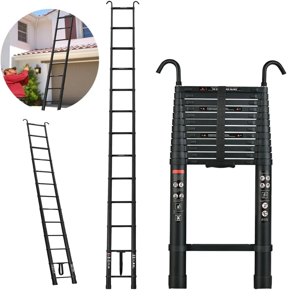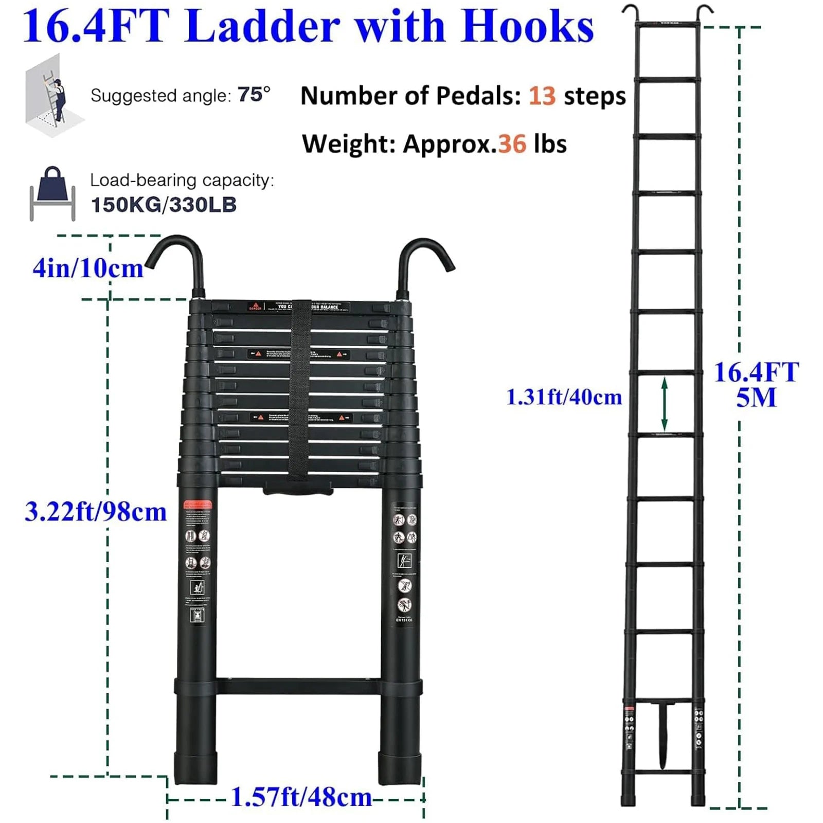 Black 5M Heavy Duty Telescopic Ladders 16.4FT Home Aluminum Extendable Roof Ladder With Detachable Hooks, Certificated EN131