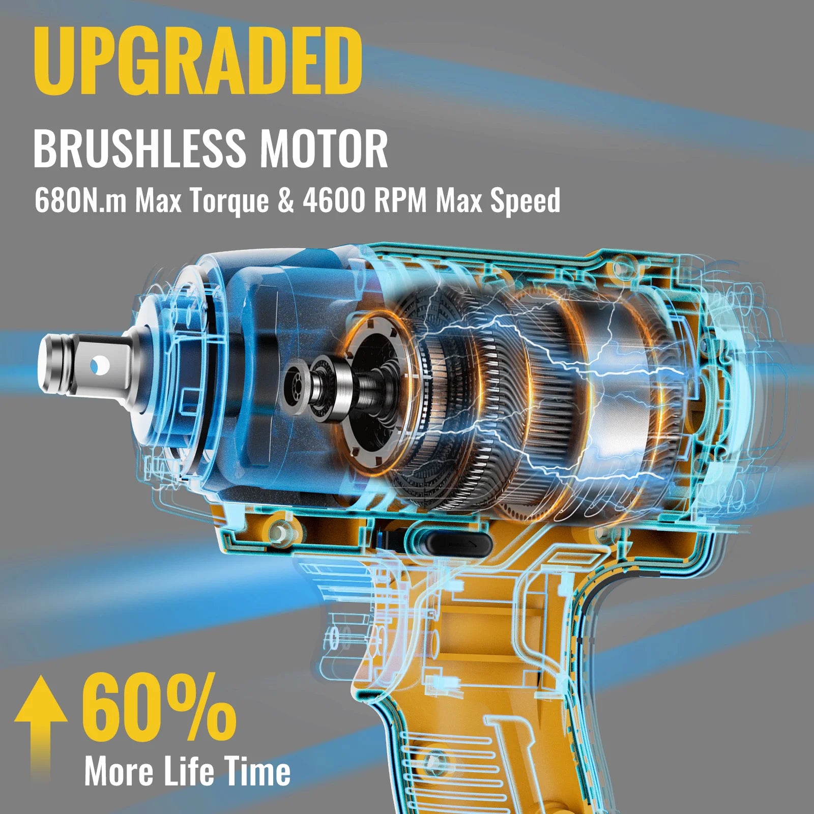 Clé à chocs sans fil sans balais CONENTOOL 680N.m 1/2", pistolet à percussion à couple élevé 4600 tr/min, outil électrique à batterie de 6,0 Ah pour voiture et maison