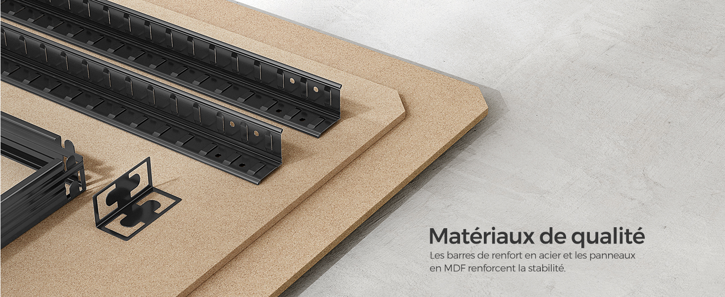 - Matériaux : Cadre en acier traité par poudrage, panneau MDF