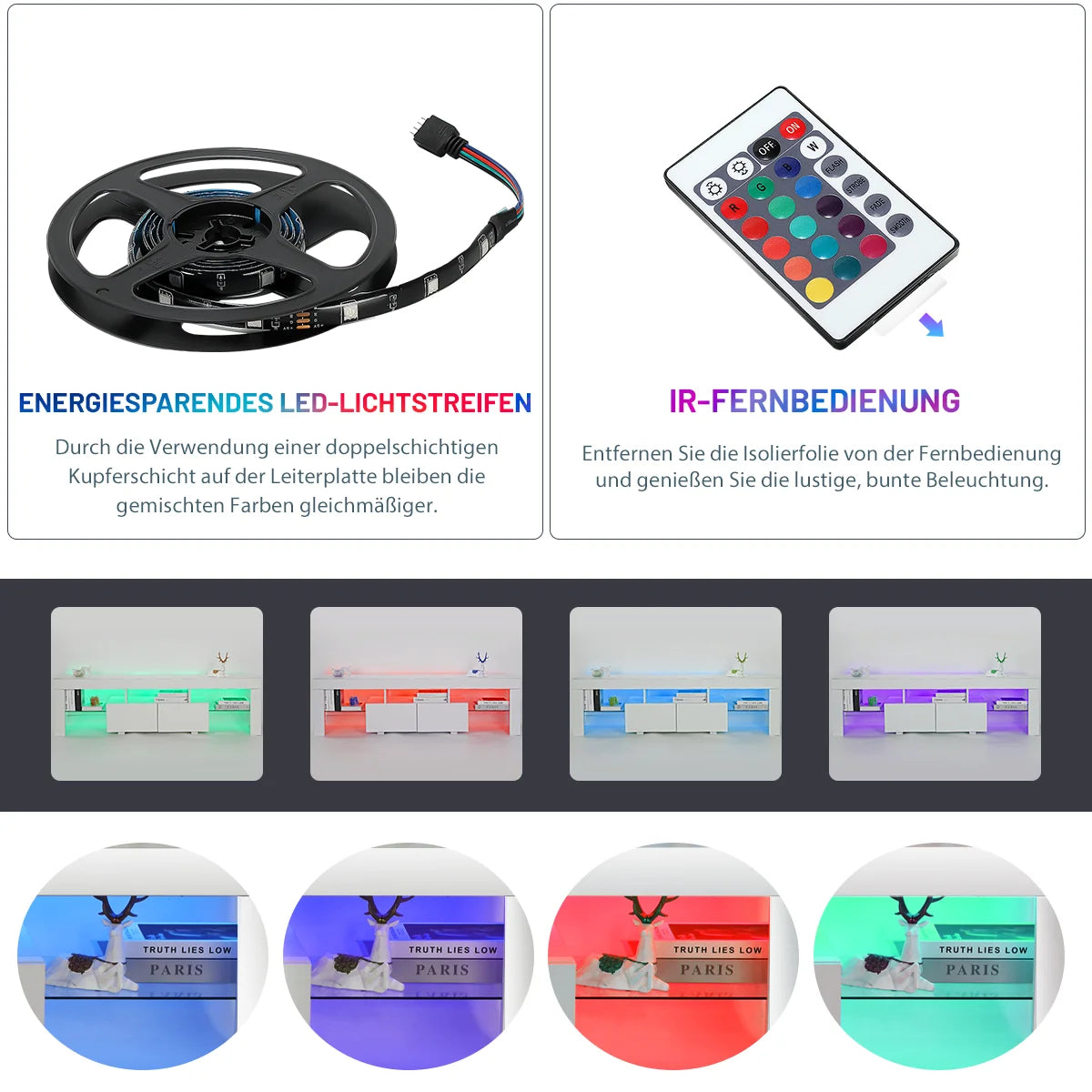 LED colors in the closet are adjustable and equipped with a remote control.