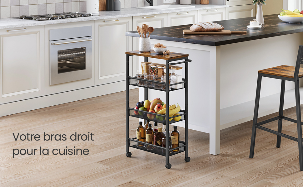 [Facile à déplacer] Grâce aux 4 roulettes et à la poignée en acier pratique,vous pouvez déplacer cette desserte peu encombrante partout où vous en avez besoin